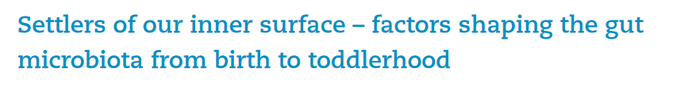 Denne perioden anses som et viktig vindu i utviklingen. Bakteriefloraen er ekstremt skjør, og mye mer mottakelig for ytre påvirkninger enn en voksenflora. Mens avansert bioinformatik og kliniske studier har fått enorm oppmerksomhet, har det vært lite fokus på studier som undersøker grunnleggende vekstforhold. I denne oversikten fokuseres på den mikrobielle økologien, mest faktorer som påvirker utviklingen av tarmbakterienes utvikling. Blant disse faktorene er kilder i miljøet som sår tarmbakteriene, og ikke- levende faktorer som påvirker veksten, dessuten tilgjengelighet av næringstoffer som bakterien er avhengige av.